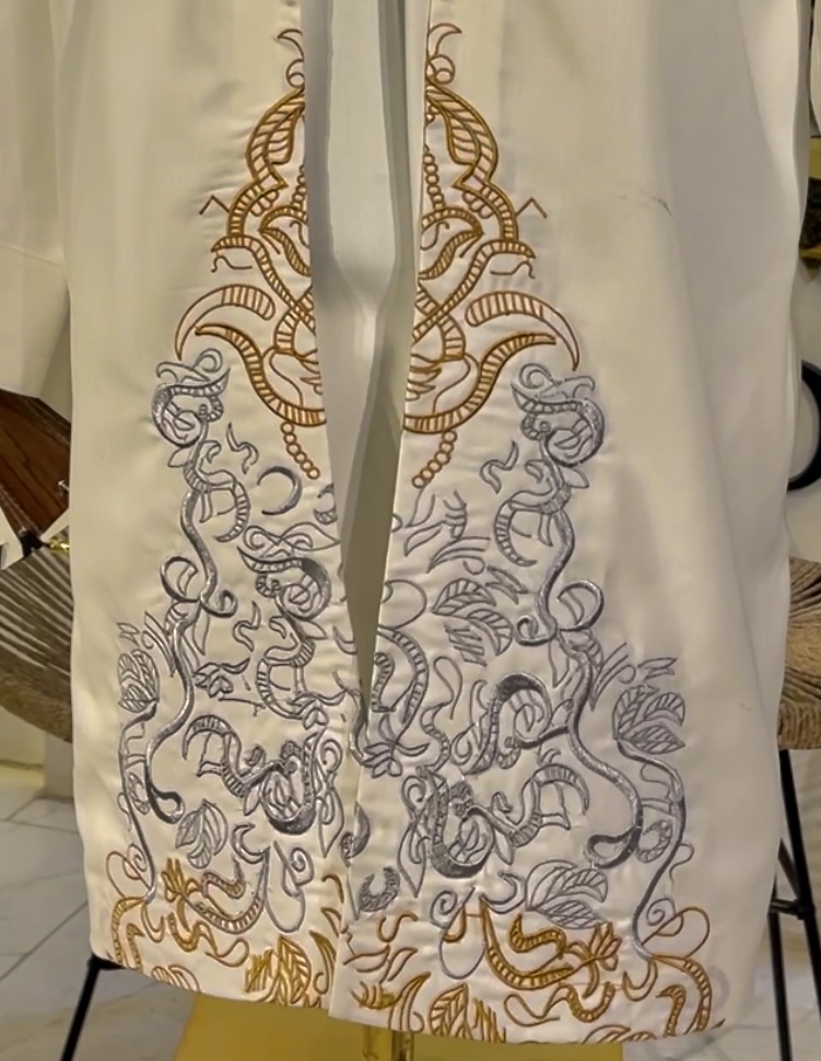 Embroidery Detail: The centerpiece of the design lies in the ornate symmetrical embroidery that runs vertically down the front.
