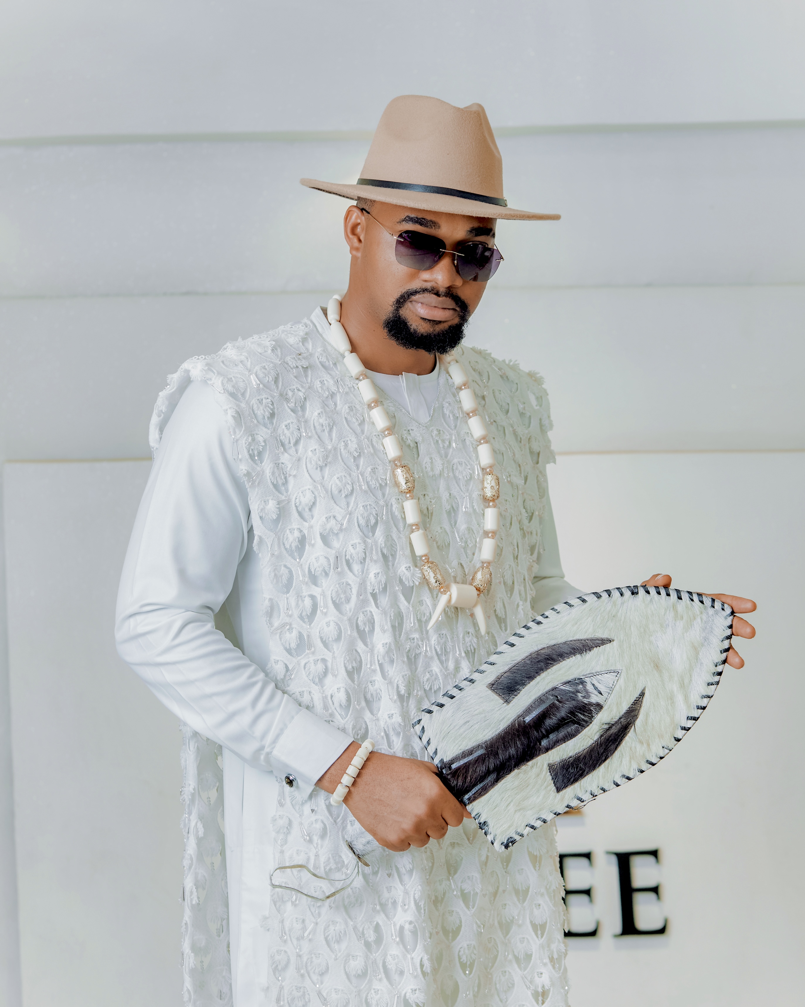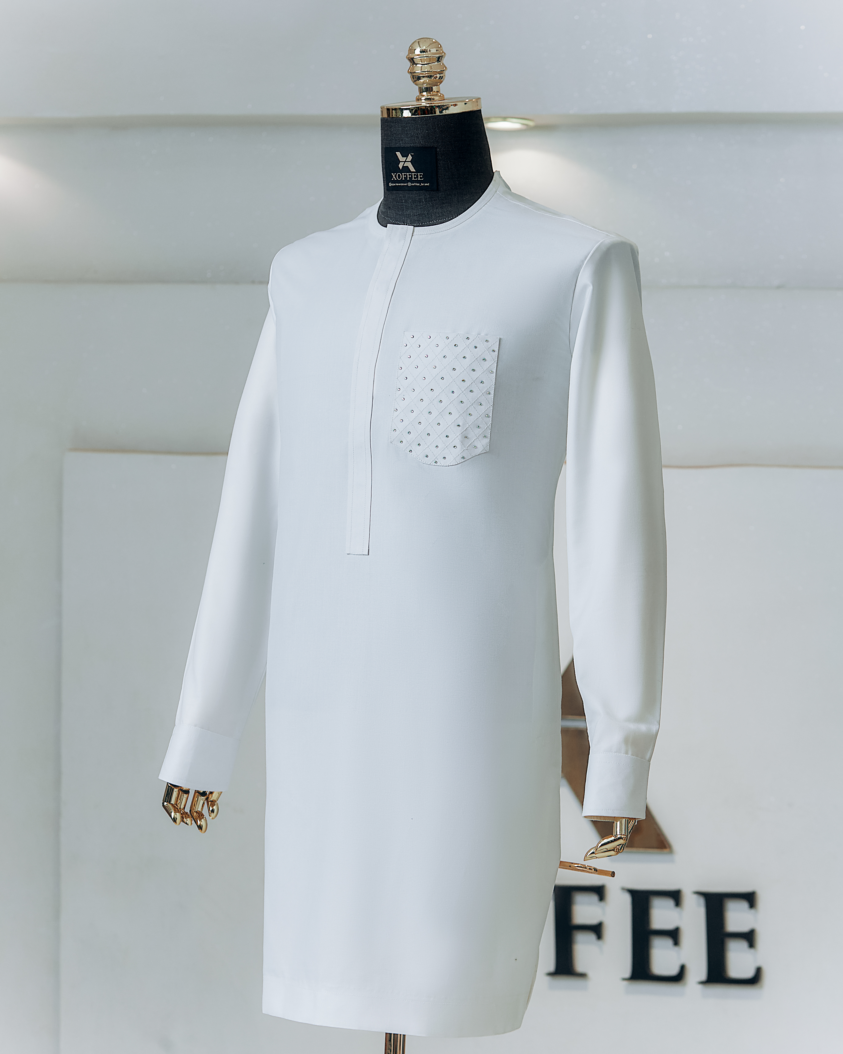 Underneath the agbada, is a clean, tailored white native kaftan or senator-style outfit, which includes a long-sleeve tunic and matching trousers. This innerwear is kept simple to balance the ornate outer layer.