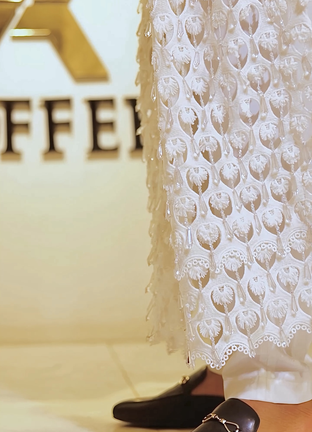 Delicate beadwork and small hanging crystal drops give texture and movement. There’s also evidence of cord embroidery, adding structure and elegance.