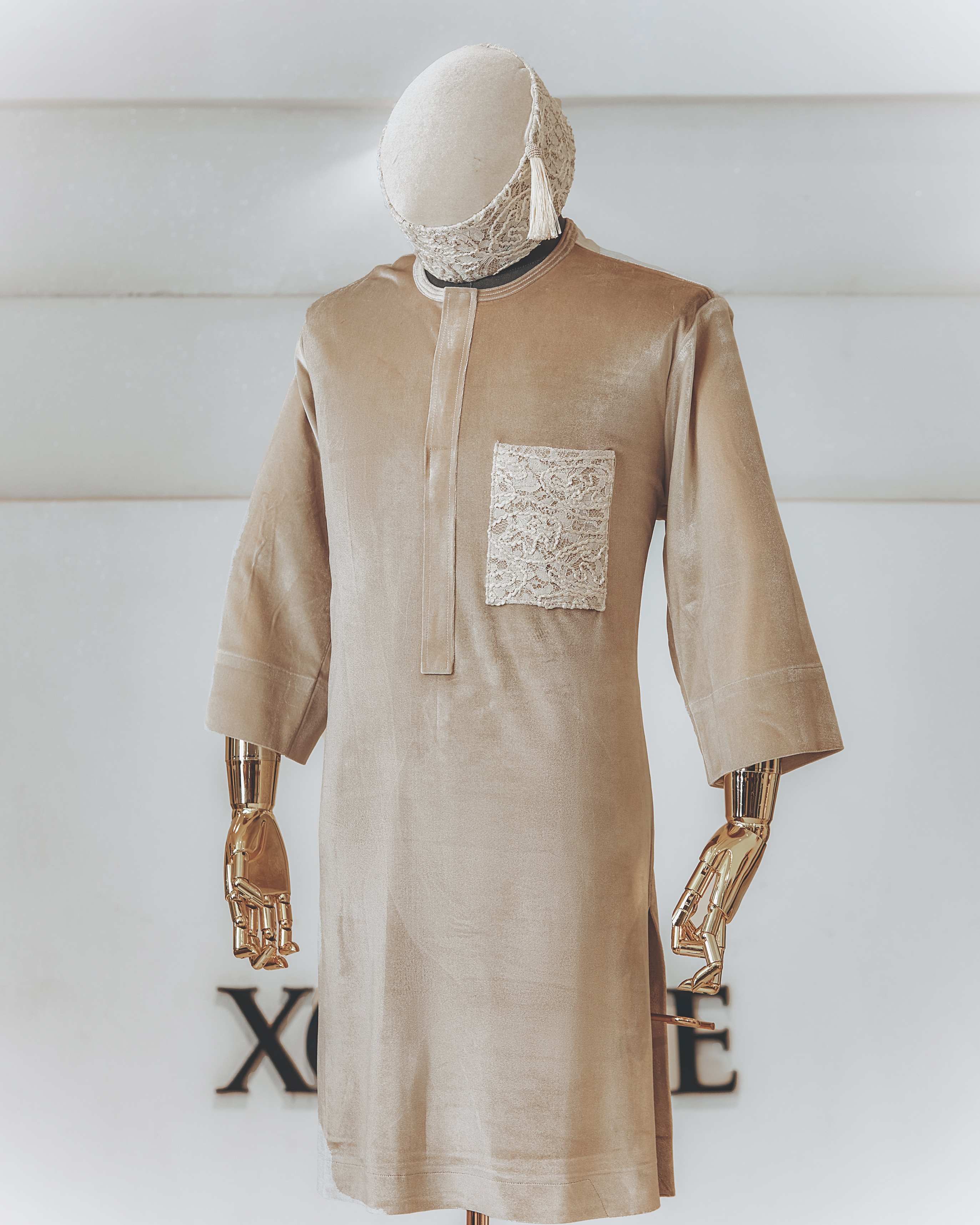 This design channels the timeless elegance of ceremonial garb while introducing modern silhouettes and regal accents. Inspired by cultural richness and gentle opulence, it celebrates a harmony between past and present.
