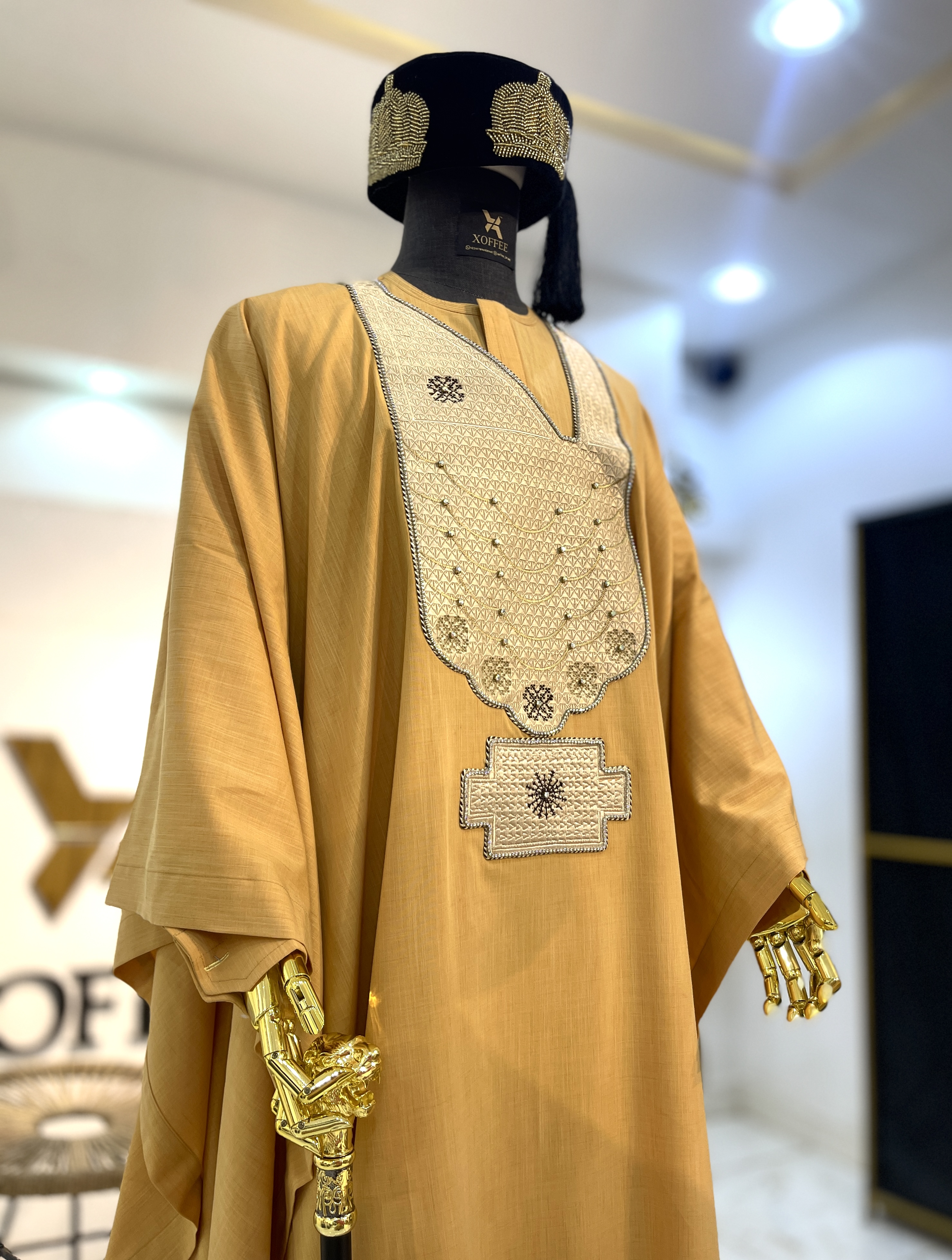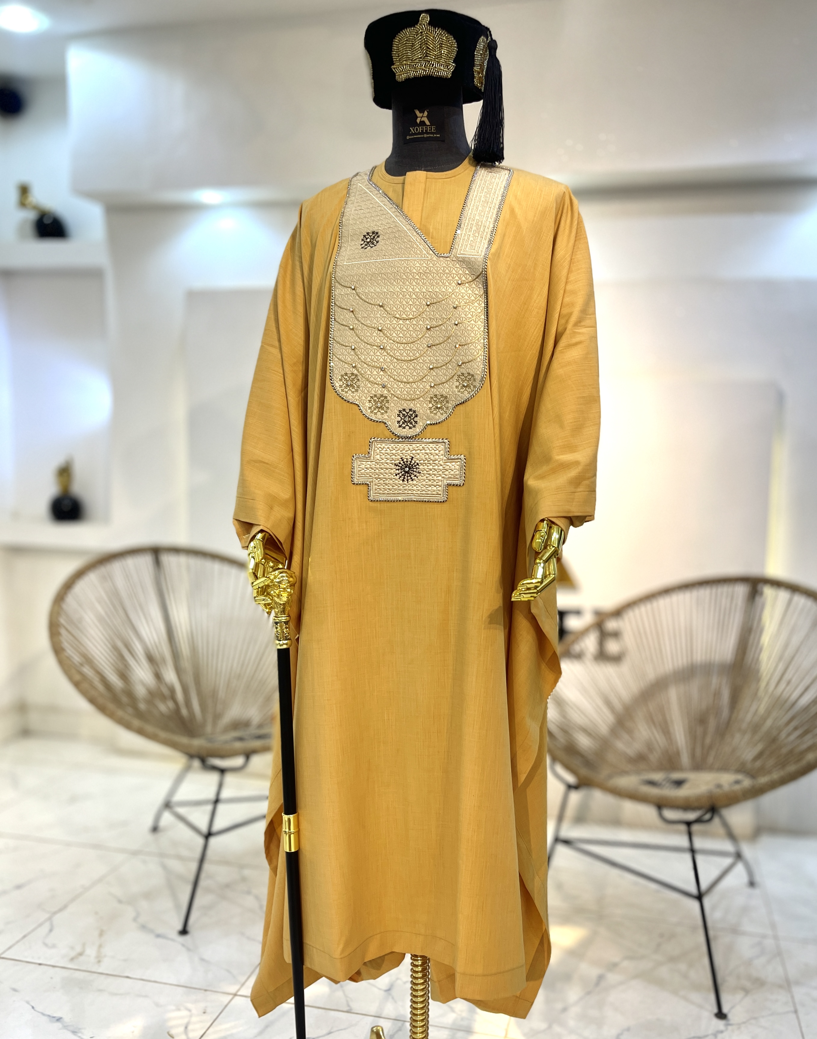 Style: A regal Agbada outfit, traditionally worn in West African cultures. It features a large, flowing outer robe layered over an inner garment, symbolizing status and grandeur.