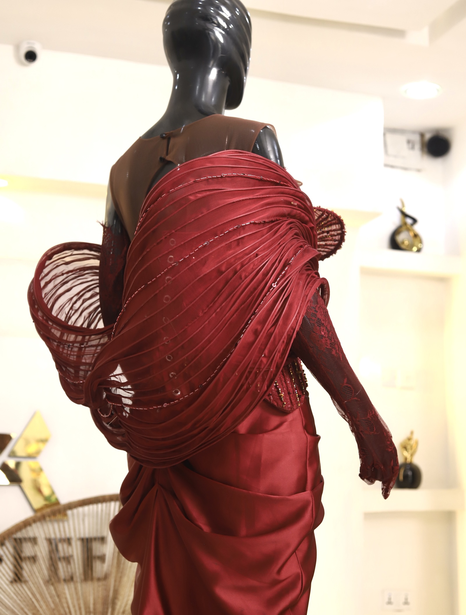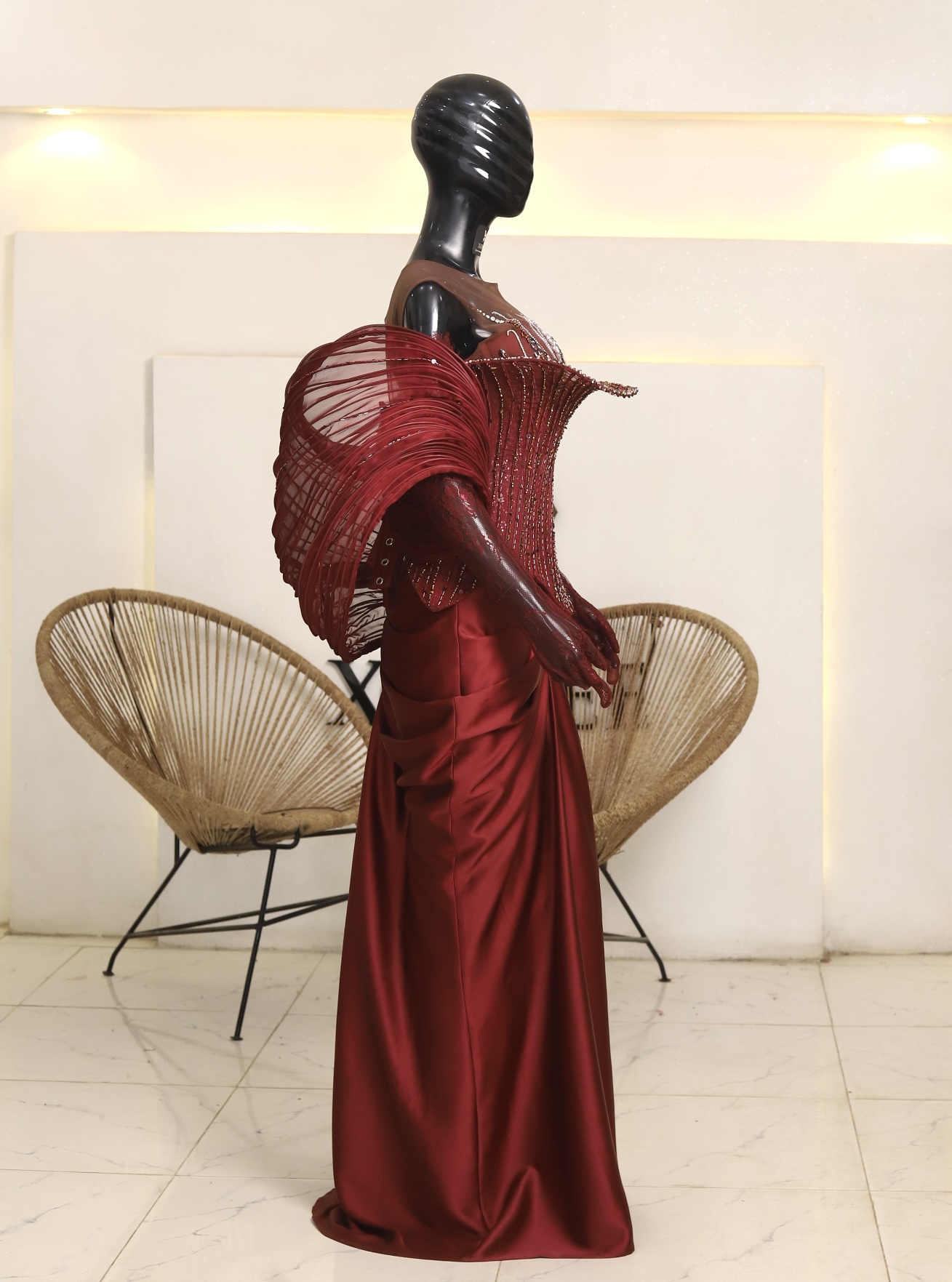 Sleeve Extensions: The mannequin also showcases long lace sleeves under the structured satin, giving the look a delicate balance between strength and softness.