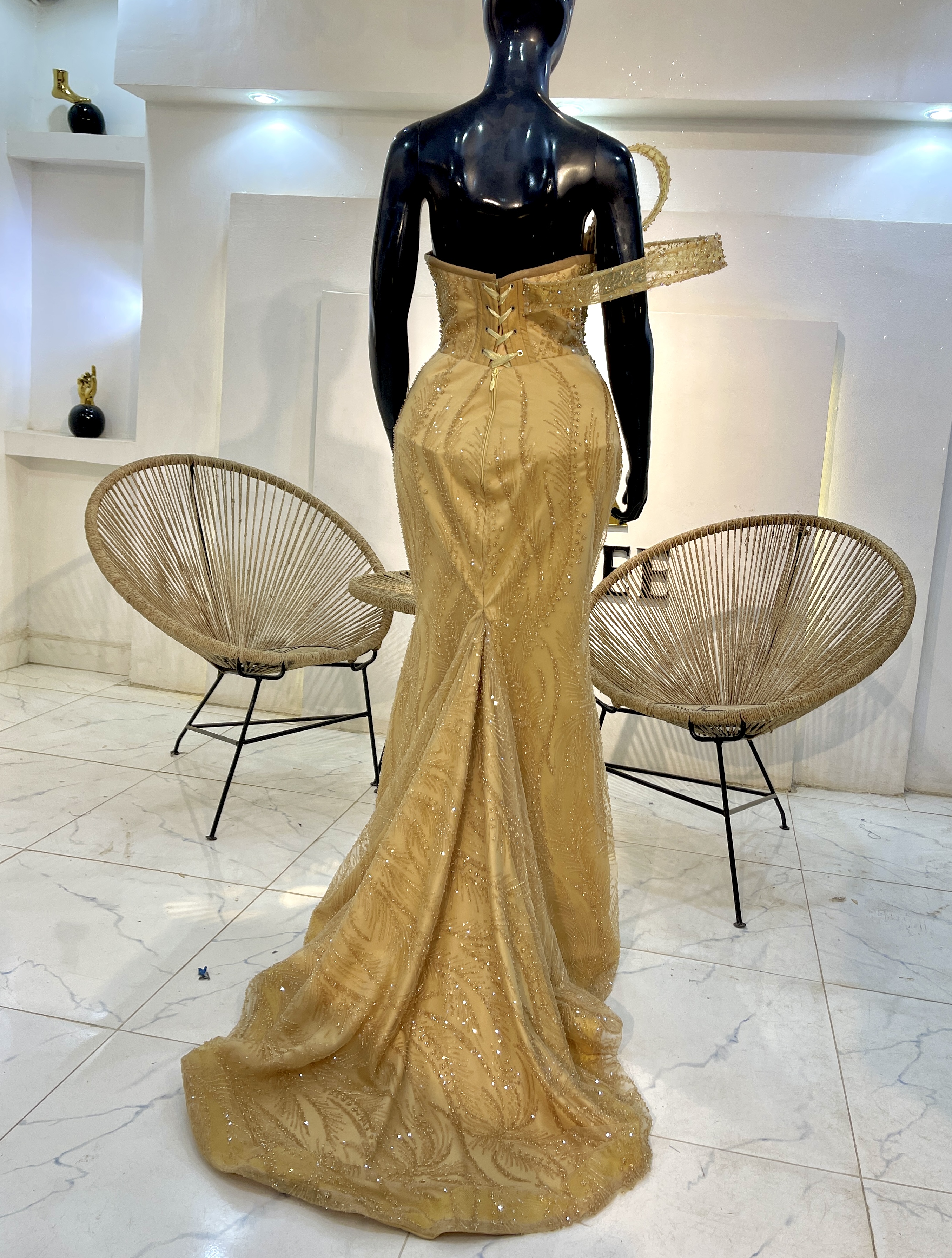 -Color Palette: Primarily golden, with warm undertones, giving the dress a rich, luxurious appearance.