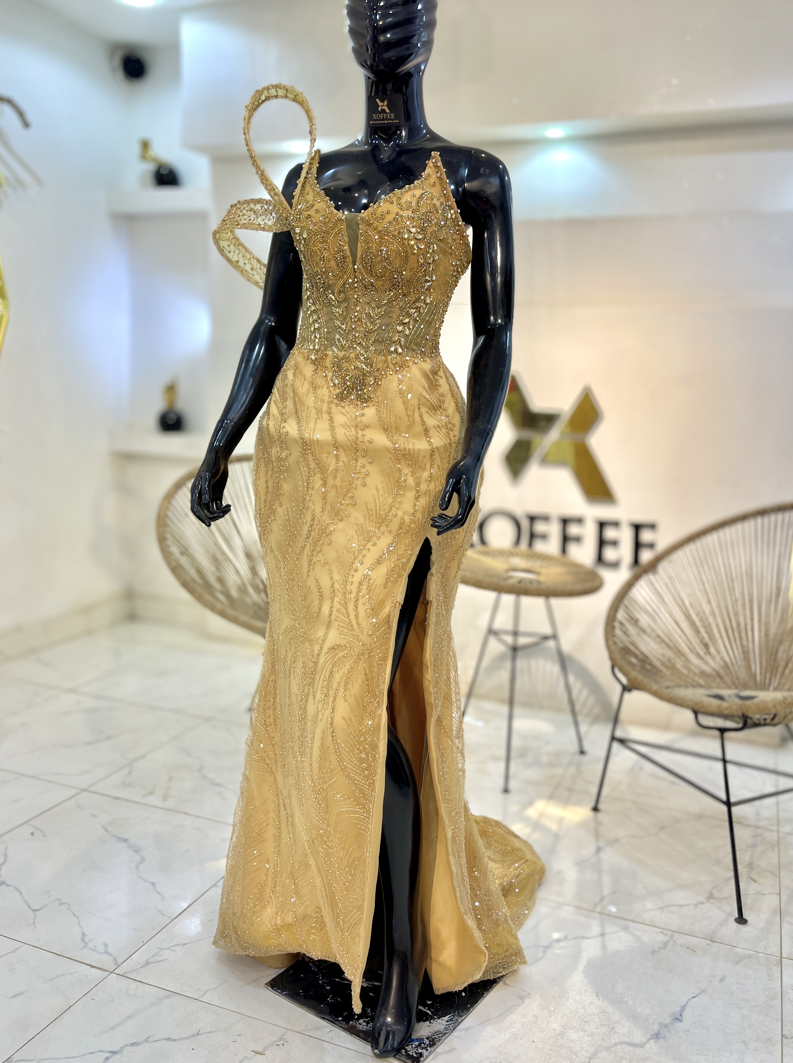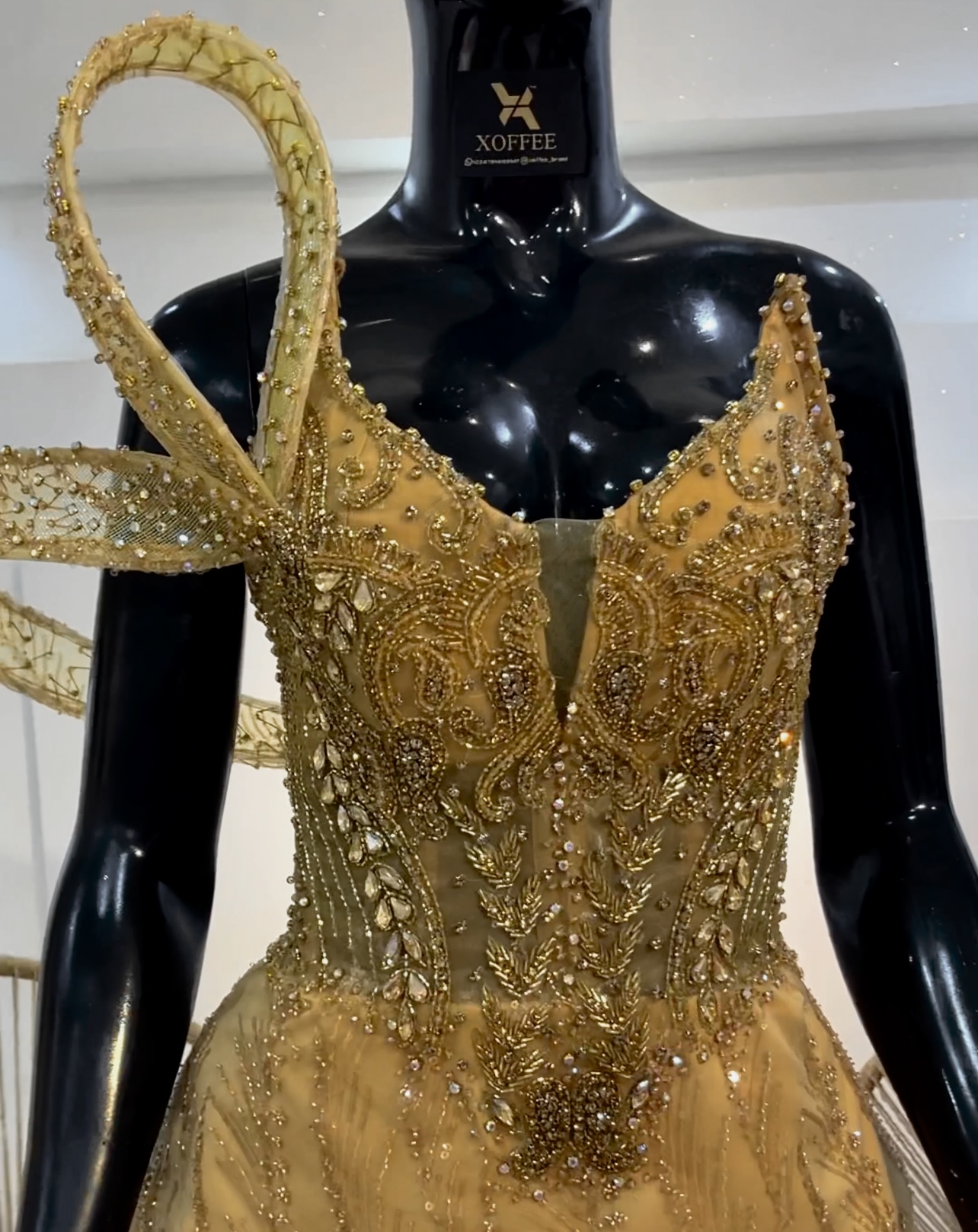 -Straps: One strap is traditionally styled, while the other transforms into a dramatic looped embellishment that extends upward and outward, resembling a sculptural ribbon or flourish. This asymmetric design adds a couture edge to the gown.