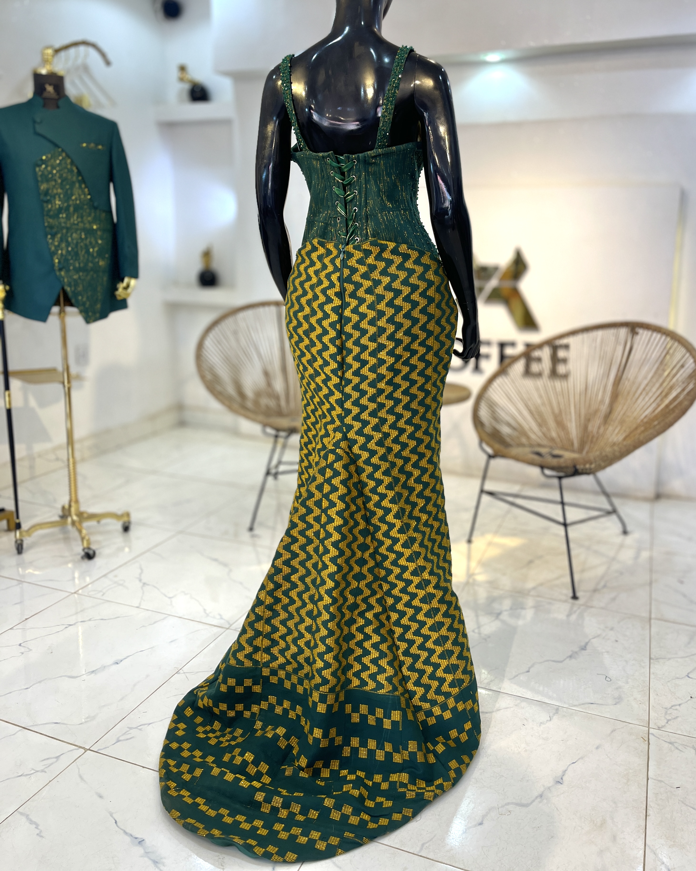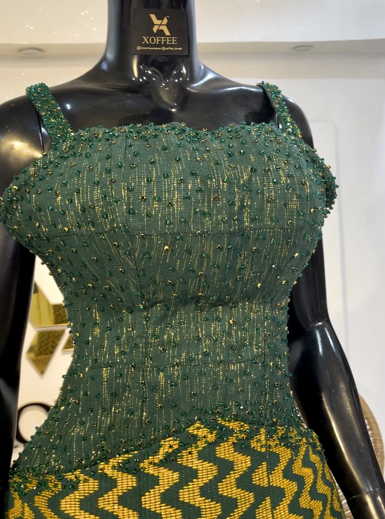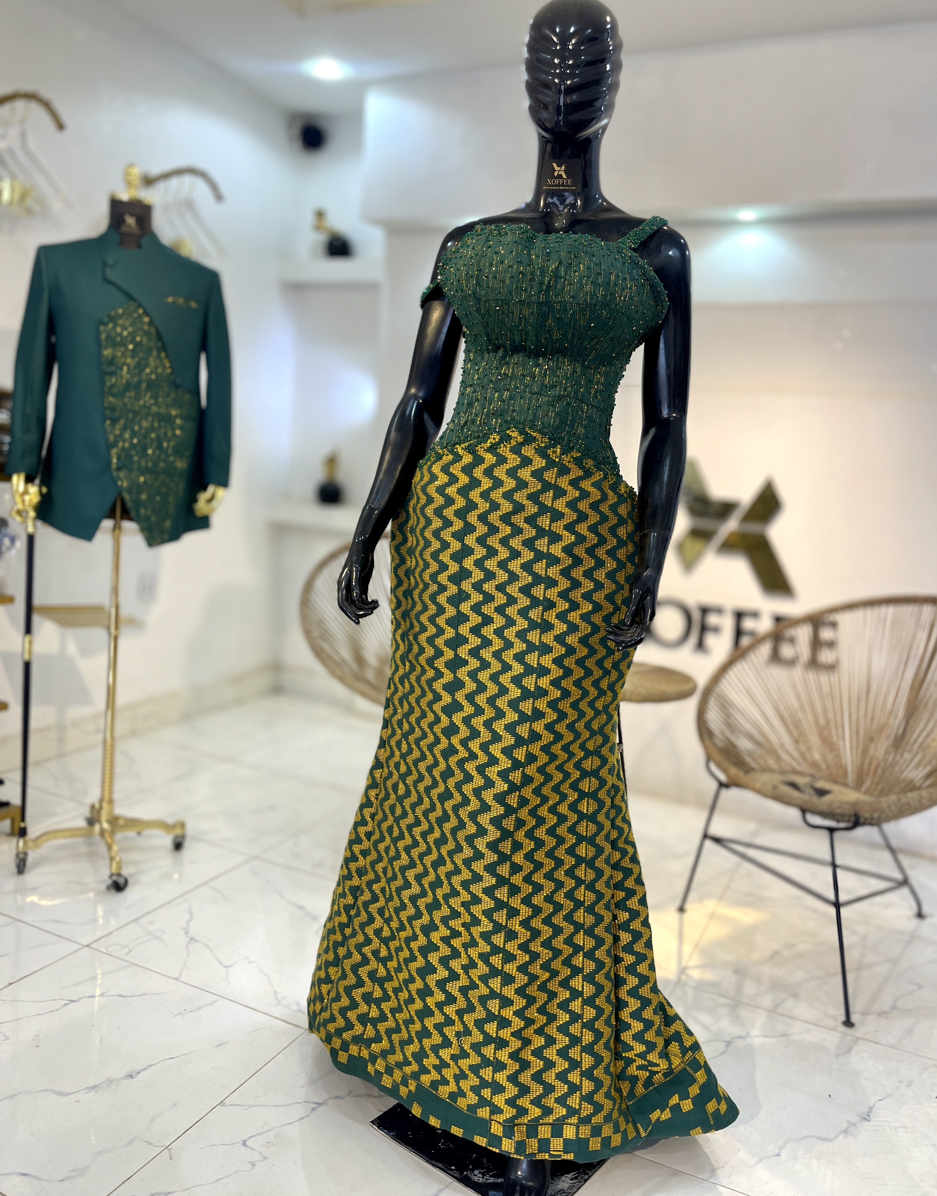 Usage: This Kente bridal look is a regal and culturally rich ensemble, It’s ideal for the engagement ceremony or traditional wedding day, symbolizing pride in one's roots, strength, and marital prosperity.
